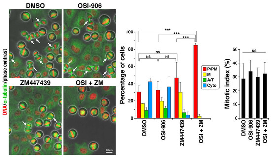 Combination of OSI-906 and ZM447439 causes severe defect in chromosome alignment. HeLa S3 cells were treated with 6 µM RO-3306 for 20 h, released by washing out this drug, and then cultured without RO-3306. After 60-min culture, the cells were fixed and stained for α-tubulin and DNA. Based on morphologies of spindle and chromosomes, mitotic cells were classified into four groups: prophase/prometaphase (P/PM, red), metaphase (M, yellow), anaphase/telophase (A/T, green), and cytokinesis (Cyto, blue). Cells were treated with 3 µM OSI-906, 1 µM ZM447439, or their combination (OSI + ZM) for 1 h at the end of the RO-3306 treatment and were continuously treated during the 60-minute release. Dimethyl sulfoxide was used as solvent control (DMSO). Representative images are shown. Arrows indicate cells after the onset of anaphase. The average value of each group and the mitotic index, a ratio of mitotic cells among total cell numbers, were calculated from three independent experiments (n > 222 in each experiment) and expressed as mean ± SD. p-values were calculated using Tukey’s multiple comparison test. *** p < 0.001. NS, not significant.