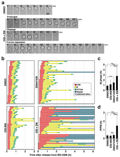 Combination of OSI-906 and ZM447439 causes mitotic slippage and cytokinesis failure. HeLa S3 cells were treated with 6 µM RO-3306 for 20 h and with either 3 µM OSI-906, 1 µM ZM447439, or their combination (OSI + ZM) for 1 h at end of the RO-3306 treatment. The cells were released by washing out the drug and then cultured continuously with inhibitors without RO-3306. Immediately after the release from RO-3306 treatment, time-lapse imaging was started. Images of bright field and Hoechst 33342 fluorescence (DNA) were captured every 5 min. (a) Representative images of cells with prolonged M phase, mitotic slippage, and furrow regression are shown. (b) The mitotic cells were classified based on their morphologies of cell shape and chromosomes into three groups: prophase/prometaphase (P/PM), metaphase (M), and anaphase/telophase/cytokinesis (A/T/Cyto). Based on the time-lapse images, the duration of each mitotic sub-phase (P/PM, M. A/T/Cyto) in individual cells are plotted in the graph (n = 40). Cells that exited mitosis without chromosome segregation and cytokinesis are shown as “Slippage.” Cells whose cleavage furrows ingressed and then regressed were shown as “cytokinesis failure.” (c,d) Mean values of the durations of M phase (c) and P/PM (d) were plotted as mean ± SD. p-values were calculated using the Games–Howell multiple comparison test. *** p < 0.001.