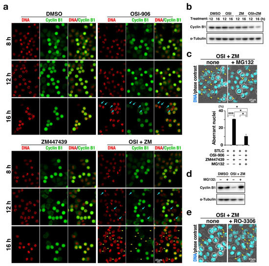 Combination of OSI-906 and ZM447439 causes mitotic slippage via precocious degradation of cyclin B1. HeLa S3 cells were treated with 7.5 µM S-trityl-L-cysteine in the presence of OSI-906, ZM447439, or their combination (OSI + ZM). Dimethyl sulfoxide was used as solvent control (DMSO). (a) At 8, 12, and 16 h after the start of treatment, cells were fixed and stained for cyclin B1 (green) and DNA (red). Representative images are shown. Blue arrows indicate M phase cells with lower expression levels of cyclin B1. Yellow arrowheads indicate cells with aberrant nuclear morphologies. Scale bar, 20 µm. (b) At 10 h after the treatment, M phase cells were collected by mitotic shake-off and further incubated in microtubes at 37 °C for 2 h and 6 h. Whole cell lysates were analyzed using Western blot with the indicated antibodies. The full blots are shown in Figure S1. (c) At 12 h after the treatment, 40 µM MG-132 was added to the culture. The cells were further incubated for 4 h and stained for DNA (cyan). Yellow arrowheads indicate cells with aberrant nuclear morphologies. Scale bar, 20 µm. The number of cells with aberrant-shaped nuclei was counted and plotted as the mean ± SD calculated from three independent experiments (n > 112). p-values were calculated using the Games–Howell multiple comparison test. * p < 0.05; *** p < 0.001. (d) At 10 h after the treatment, M phase cells were collected by mitotic shake-off and further incubated in microtubes at 37 °C for 6 h. During the last 4 h of incubation in microtubes, the cells were treated with 40 µM MG-132. Whole cell lysates were analyzed using Western blot with the indicated antibodies. The full blots are shown in Figure S1. (e) At 10 h after the treatment, 6 µM RO-3306 was added to the culture. The cells were further incubated for 2 h and stained for DNA (cyan). Yellow arrowheads indicate cells with aberrant nuclear morphologies. Scale bar, 20 µm.