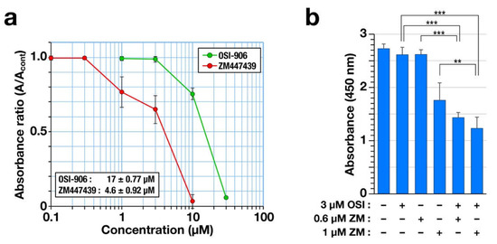 OSI-906 has been used in clinical trials for the treatment of lung cancer [21,22,23]. Therefore, the combination treatment effect on cell viability was examined for human non-small cell lung cancer A549 cells. First, a WST-8 assay was performed to determine the IC50 values. The absorbance of reduced 2-(2-methoxy-4-nitrophenyl)-3-(4-nitrophenyl)-5-(2,4-isulfophenyl)-2H-tetrazolium monosodium salt at 450 nm showed that both OSI-906 and ZM447439 reduced cell viability in a concentration-dependent manner. The IC50 values are shown in the graph (Figure 6a). Next, we examined the possibility of the OSI-906 and ZM447439 synergism using the methods reported by Chou and Talalay [24]. Although 3 µM OSI-906 showed almost no effect on cell viability, the combination with either 0.6 µM or 1 µM ZM447439 significantly reduced cell viability compared to the single treatment (Figure 6b). Combination index (CI) values were 0.32 (combined with 0.6 µM ZM447439) and 0.35 (combined with 1 µM ZM447439). The obtained values were less than 1, suggesting the possibility of OSI-906 and ZM447439 synergism for the reduction of cell viability in human non-small cell lung cancer A549 cells.