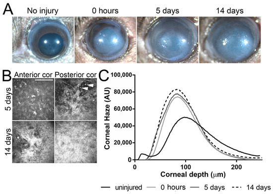 Corneal haze, scarring and the presence of inflammatory cells within the cornea were analyzed by in vivo confocal microscopy, as described previously, using a Heidelberg Retinal Tomograph-HRTII Rostock Cornea Module (HRT-II, Heidelberg Engineering Inc., Heidelberg, Germany) [42,123]. For such, mice were anesthetized with a combination of ketamine and xylazine, as described above, and placed in a mouse holder that was designed by us at the college of Optometry, University of Houston. GenTeal gel (Novartis Pharmaceuticals Corp.) was applied to both the eyeball and the tip of the HRT-II objective as an immersion fluid. Subsequently, a series of 40 images were collected starting at the outer epithelial layer through the whole stromal thickness and ending at the corneal endothelium as a continuous z axis scan at 2-μm increments. Corneas of mice 5 and 14 days after AB had an increase in corneal thickness as a consequence of edema, and, therefore, required the collection of two sequential series through the cornea in order to encompass the entire thickness. The lens of the HRT-II has a working distance of 77 μm. Images were exported as a sequence of tiff files and analyzed using ImageJ (Fiji Is Just Image J, an open-source platform for biological-image analysis). Five mice were analyzed per experimental point and a representative profile presented in the figure.