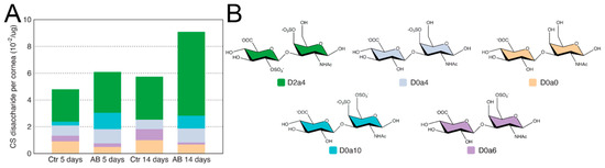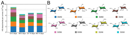 In this study, we used the well-established AB mouse model to assess the change in GAG composition during corneal wound healing 5 and 14 days after a chemical injury. This model leads to inflammatory cell infiltration and corneal scarring, and the loss of transparency is evident at both 5 and 14 days after AB [56,57,58,59,60]. Disaccharide analysis revealed there was a significant increase in CS expression after AB, and, thus, CSPGs are important constituents of the provisional matrix in the cornea. Importantly, the CS chains that are expressed following AB are more highly sulfated than those expressed in the uninjured cornea. Thus, highly sulfated CS could potentially play a role in the provisional matrix during wound healing and also be part of the corneal scarring process. Interestingly, CS/DS sulfatases are a family of enzymes that catalyze the hydrolysis of the sulfate groups on CS/DS and have been identified in many mammalian and bacterial species [61]. Further studies would have to establish whether targeting sulfated CS with extracellular sulfatases could be used as a pharmaceutical target for limiting corneal scarring after injury.