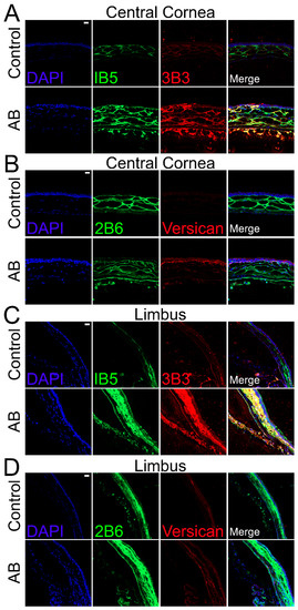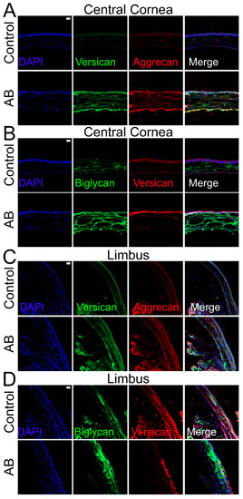 Expression and localization of versican, aggrecan and biglycan in the central corneal and limbal region of mice before and after AB. Mouse corneas were subjected to AB and corneas analyzed after 14 days, with contralateral corneas used as controls. The central cornea (A,B) and the limbal region (C,D) were imaged under a confocal microscope. The expression and localization of versican and aggrecan (A,C), and, biglycan and versican (B,D) were analyzed using immunocytochemistry. Nuclei were stained with DAPI (blue). Scale bar 20 μm. Seven corneas were analyzed per experimental group and a representative image displayed.