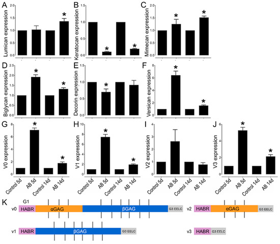 Relative expression profile of CSPGs and KSPGs in mouse corneas after AB. Mouse corneas were subjected to AB and analyzed after 5 and 14 days, compared to the contralateral uninjured eye. Real-time PCR (qPCR) analysis was done to verify the expression levels of lumican (A), keratocan (B), mimecan (C), biglycan (D), decorin (E), versican (F), V0 (G), V1 (H), V2 (I), and V3 (J). The relative expression levels were normalized against the arithmetic mean of GAPDH and beta-actin using the 2−ΔΔCt method. * represents p ≤ 0.05. Five corneas were analyzed per experimental group. Schematic representation of the different domains of versican spliced variants (K). The different variants bind to HA via the G1 domain (HABR—pink). The CS-bearing domains GAGα (orange) and GAGβ (blue) are represented with the CS chains as black straight lines. Finally, the G3 domain (gray) contains epidermal growth factor (EGF)-like repeats, a lectin-like motif and another HA binding domain, enabling further interactions with HA [44,45]).