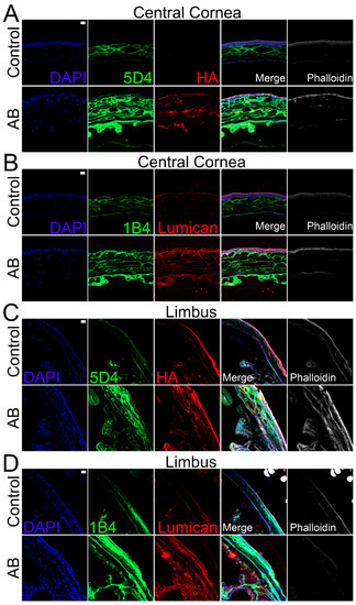 Expression and localization of different KS epitopes, HA and lumican in the central corneal and limbal region of mice before and after AB. Mouse corneas were subjected to AB and corneas analyzed after 14 days, with contralateral corneas used as controls. The central cornea (A,B) and the limbal region (C,D) were imaged under a confocal microscope. The expression and localization of highly sulfated KS (5D4) and HA were analyzed using immunocytochemistry (A,C). The expression and localization of lesser sulfated KS (1B4) and lumican were analyzed using immunocytochemistry (B,D). Nuclei were stained with DAPI (blue). Scale bar 20 μm. Seven corneas were analyzed per experimental point and a representative image displayed.