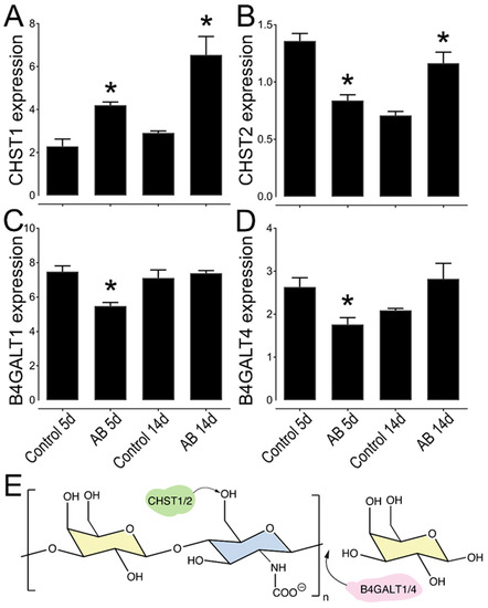 Relative expression profile of KS biosynthetic enzymes in mouse corneas after AB. Mouse corneas were subjected to AB and analyzed after 5 and 14 days, compared to the contralateral uninjured eye. Real-time PCR analysis (qPCR) was done to verify the expression levels of CHST1 (A), CHST2 (B), B4GALT1 (C), and B4GALT4 (D). The relative expression levels were normalized against GAPDH using the 2−ΔCt method. * represents p ≤ 0.05. Five corneas were analyzed per experimental group. Schematic representation of the activity of each enzyme analyzed, CHST1 and 2 catalyze the transfer of a sulfate to the position 6 of galactose, while B4GALT1 and 4 catalyze the transfer of a galatose residue to the polymerizing KS chain (E).