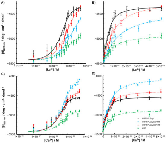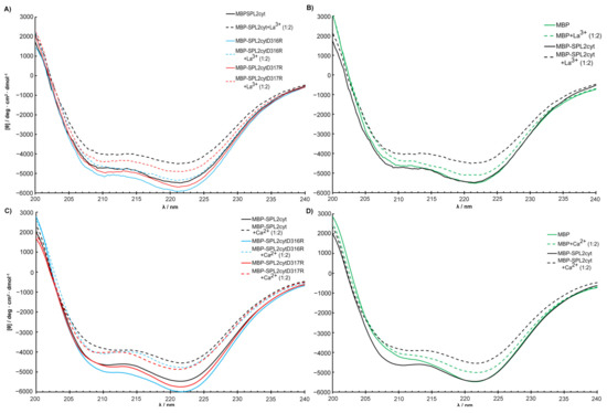 Structural changes in MBP-SPL2cyt and its mutants upon binding of (A) La3+ and (C) Ca2+ measured by CD. (B,D) Effects of La3+ and Ca2+, respectively, on the conformation of MBP and MBP-SPL2cyt. For direct comparison of MBP and MBP-SPL2cyt, spectra shown in (B,D) were normalized at 220 nm.