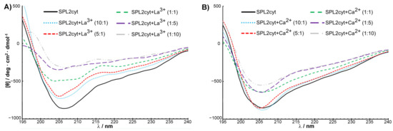 Encouraged by preliminary luminescence data that provided the first evidence for interactions between Tb3+ and SPL2cyt, we investigated metal binding by complementary techniques such as CD. The application of CD for monitoring the changes in the secondary structure of a protein upon interaction with ligands is well documented. Following the addition of La3+, a 1 nm blueshift of the negative peak is detectable, indicating that SPL2cyt undergoes a conformational change (Figure 6A) which is, however, not detectable by the SPL2cyt elution profile from size-exclusion chromatography (Figure A4, Appendix A). More importantly, the CD spectrum of SPL2cyt shows a significant increase in ellipticity at 205 and 220 nm corresponding to a loss of α-helical and β-sheet structure in the protein. This change in the CD spectrum was observed even at low concentrations of La3+ and may implicate a transition to a random coil composition upon the metal binding. Interestingly, low concentrations of Ca2+ did not induce such prominent changes in the UV region of the CD spectrum; however, the conformation of SPL2cyt was still affected but at higher Ca2+ concentrations probed here. Nevertheless, this effect is not as drastic as changes induced by La3+ ions (Figure 6B). The spectra recorded in the presence of La3+ or Ca2+ binding show that both ions affect the protein secondary structure, and differences between spectra could arise from the different binding constants of Ca2+ and La3+ (Table 1).