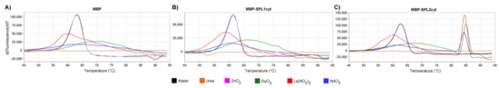 Apart from structural transitions, the interaction between ligands and proteins may induce changes in protein thermal stability. We investigated this possibility by measuring changes in the thermal denaturation point using differential scanning fluorimetry. Zinc ions, which are natively present in the RING domain of E3 ligases, did not affect the protein stability, unlike lanthanide ions, which, in turn, significantly increased the thermal stability of MBP-SPL2cyt (Figure 7C). Importantly, neither MBP nor MBP-SPL1cyt showed any signs of stabilization in the presence of the assayed metal ions (Figure 7A,B, respectively).