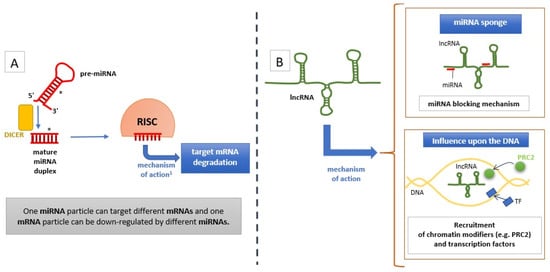 Mechanism of action of miRNA (A) and lncRNA (B). * = miRNA fragment more close to 3′ end, 1 = mRNA degradation is a crucial mechanism of action of miRNA, other mechanisms, like translational repression or even translational activation, are also possible; abbreviations: RISC = RNA-induced silencing complex, TF = transcription factors, PRC2 = polycomb repressive complex 2, a complex with histone methyltransferase activity.