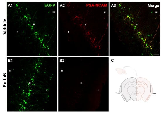 Removal of PSA in the PCX by Endo-N. (A,B) Confocal microscopic images of EGFP (green) and PSA-NCAM (red) immunoreactive neurons in the vehicle (A1–3) and Endo-N (B1,2) injected hemispheres. Note the complete absence of PSA-NCAM expression in the hemisphere injected with Endo-N. (C) Drawing showing the hemispheres injected with vehicle (left) or Endo-N (right). Scale bar: 70 µm.