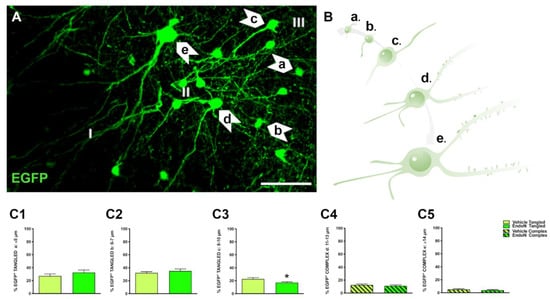 In the PCX layer II, EGFP+ neurons were classified into tangled and complex cells as described in previous studies [,]. In addition, EGFP+ neurons were further divided in 5 subgroups according to their soma diameter and maturational stage: tangled a: small tangled cells (ø ≤ 5 µm); tangled b: tangled cells with short dendritic arborizations (ø = 6–7 µm); tangled c: tangled cells with longer dendritic arborizations (ø = 8–10 µm); complex d: larger complex cells with thin basal processes and dendritic spines (ø = 11–13 µm) complex e: mature, complex cells with larger dendrites and mature dendritic spines (ø ≥ 14 µm) (Figure 2A,B). To study the impact of PSA depletion on EGFP+ neurons, we analyzed their distribution into the 5 subpopulations (Figure 2C) for the vehicle-treated vs. the Endo-N-treated hemisphere. As previously observed, tangled cells were more abundant than complex cells in both hemispheres. Importantly, a significant decrease in the percentage of tangled cells with 8–10 µm diameter was observed in the hemisphere treated with Endo-N (p = 0.02, Figure 2C3).