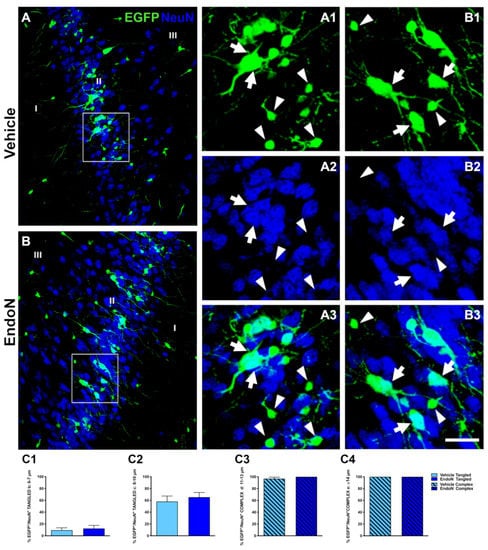 Effects of Endo-N injection on the percentage of EGFP+ cells displaying NeuN+ nuclei. (A,B) Confocal images showing EGFP+ cells (green) and NeuN-expressing cells (blue). (A1–3,B1–3) Higher magnifications of the squared areas in A and B. In these insets, tangled and complex EGFP+ cells are indicated by arrowheads and arrows, respectively. Note the presence of a larger number of EGFP+ complex cells labeled with NeuN in the Endo-N hemisphere. (C1–4) Graphs representing the percentage of EGFP+/NeuN+ neurons classified as tangled or complex cells according to their diameter. Scale bar: 70 µm.