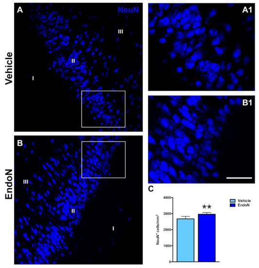 Effects of Endo-N injection on the density of NeuN-expressing cells. (A,B) Single confocal sections showing the expression of NeuN in the PCX. (A1,B1) are higher magnifications of the squared areas in (A,B), which show the different densities of NeuN immunoreactive nuclei in the PCX layer II. (C) Graph showing the effect of Endo-N injection on the density of NeuN immunoreactive nuclei in the PCX layer II. Asterisks indicate statistically significant differences between hemispheres (vehicle vs. Endo-N) after paired Student’s t-test. (** p < 0.01). Scale bar represents 70 µm for (A,B) and 120 µm for (A1,B1).