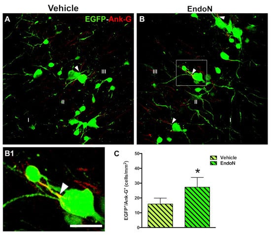 Effects of Endo-N injection on the density of EGFP+ complex cells displaying an AIS. (A,B) Panoramic views of the PCX layer II with EGFP+ cells (green) showing axon initial segments (AIS) (red) identified by the expression of the protein Ank-G. Note the presence of a larger number of EGFP+ complex cells displaying an AIS in the Endo-N hemisphere. (B1) Higher magnification of the squared area in B. An arrowhead indicates the AIS. (C) Graph showing a higher density of EGFP+ complex cells expressing Ank-G in the Endo-N hemisphere. Asterisks indicate statistically significant differences between hemispheres (Vehicle vs. Endo-N) after paired Student’s t-test. (* p ≤ 0.05) Scale bar represents 30 µm for A and B, and 55 µm for B1.
