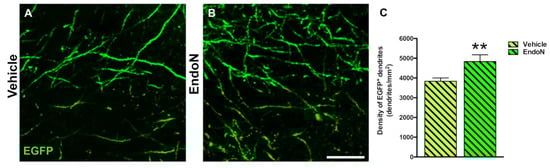 Confocal analysis of the density of EGFP+ dendrites in the PCX layer I. (A,B) Single confocal planes showing dendritic processes in the vehicle (A) and Endo-N (B) hemispheres. (C) Graph showing a higher density of dendrites in the Endo-N versus the vehicle hemisphere. Asterisks indicate statistically significant differences between hemispheres (Vehicle vs. Endo-N) after paired Student’s t-test. (** p < 0.01). Scale bar: 10 µm.