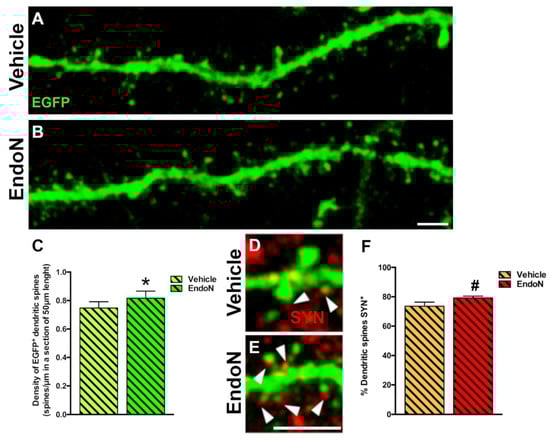 Confocal analysis of the density of dendritic spines in the PCX layer I. (A,B) 2D projections of confocal stacks (20 confocal planes separated by 0.38 µm) of spiny dendrites from the vehicle (A) and Endo-N (B) hemispheres. (C) Graph showing increased the density of dendritic spines in a segment of 50 µm in the Endo-N hemisphere. (D,E) Higher magnification views of the dendritic spines of complex EGFP+ cells in close apposition to puncta expressing the presynaptic markers SYN (red) on their surface. Note the presence of a larger number of puncta expressing SYN (arrowheads) in the Endo-N hemisphere (E) when compared to the vehicle hemisphere (D). (F) Graphs showing the percentage of puncta expressing SYN apposed to EGFP+ spines. Asterisks indicate statistically significant differences between hemispheres (Vehicle vs. Endo-N) after paired Student’s t-test. (* p ≤ 0.05; 0.05 < # p < 0.1). Scale bar: 5 µm (B) and 15 µm (E).