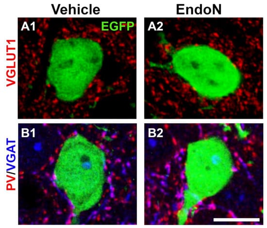 Excitatory and inhibitory puncta in the perisomatic region of EGFP+ complex cells in the PCX layer II. (A,B) 2D projections of single confocal stacks showing VGLUT1+ (A, red), VGAT+ (B, blue) and PV+ (B, red) puncta in the perisomatic region of EGFP+ complex cells (green) in the vehicle (A1,B1) and Endo-N (A2,B2) injected hemispheres. Scale bar: 10 µm.