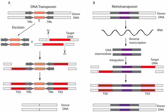 DNA transposons are widespread across the three domains of life, although they are currently inactive in most mammals. These transposons move via a “cut and paste” mechanism (Figure 2A) by which a transposase mediates transposon movement by double-strand DNA cleavage and insertion. Thus, a DNA sequence is excised by the transposase from one region and integrated into another region of the genome [42,50]. Transposases are flanked by terminal inverted repeats (TIRs) (Figure 2A). On the contrary, retrotransposons move via a “copy and paste” mechanism (Figure 2B), using RT to transcribe the RNA back into DNA and an integrase or endonuclease to insert it into a new genomic location [51]. Therefore, unlike DNA transposons, retrotransposons are not replicated. When transposons are inserted into the new genomic location, the DNA at the target site duplicates, producing target site duplications (TSDs) (Figure 2A,B).