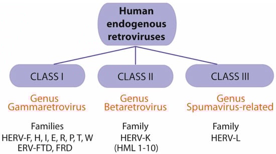 Several systems have been proposed to classify and name HERVs. A widely used nomenclature is based on the amino acid specificity of the tRNA that binds to the primer-binding site (PBS) to elicit reverse transcription. The one-letter code for the corresponding amino acid is added to the acronym HERV: HERV-H, -T, -W, -K, etc. [71,95]. On the other hand, an accepted classification is based on similarity to their exogenous counterparts. Thus, HERVs can be organized into three classes: class I (genus Gammaretrovirus), class II (genus Betaretrovirus), and class III (genus Spumavirus-related) (Figure 4). Families HERV-F, H, I, E, R, P, T, W as well as ERV-FTD and FRD belong to genus Gammaretrovirus. Betaretroviruses contain the HERV-K family (HML1-10 subfamilies), and the Spumavirus-related family includes the HERV-L family (Figure 4).
