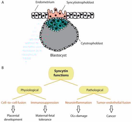 Physiological and pathological functions of syncytin. (A) When the embryo reaches the blastocyst stage, it undergoes implantation into the endometrium of the uterine wall. During implantation, the trophoblast (cells that form the outer layer of the blastocyst) develops into two layers: the cytotrophoblast and syncytiotrophoblast. The syncytiotrophoblast invades the maternal endometrium and directly contacts the maternal capillaries. Syncytin-1 plays a major role in syncytiotrophoblast cell fusion and, therefore, in embryonic development. (B). Besides cell-to-cell fusion, syncytin-1 exerts an immunosuppressive function that inhibits rejection of the fetus by the maternal immune system. However, syncytin-1 exerts also pathological functions, such as neuroinflammation and tumor-endothelial cell fusion. (OLs = oligodendrocytes).