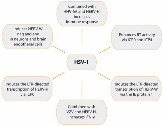 It has been demonstrated that a simultaneous presence of HERVs and herpesvirus antigens has a strong effect on immune responses. Thus, combinations of inactivated herpesviruses (especially HHV-6A and HSV-1) and HERV-H antigens greatly increased immune responses in vitro in PBMCs from MS patients and healthy controls [204]. This increase was synergistic for HHV-6A, HSV-1, and VZV antigens combined with HERV-H, whereas there was no such effect with CMV. To investigate whether the in vitro findings were relevant in vivo, the authors analyzed the ability of herpes antigens to activate HERVs [35]. The results showed that HSV-1, HHV-6A, and VZV, but not CMV, induced endogenous RT activity [35] mediated by HERV-H activation. The experiments were performed with inactivated herpesviruses and thus were infection-independent, suggesting that activation of HERVs was directly due to viral proteins. Once activated, HERVs may promote several mechanisms, such as molecular mimicry, neurotoxicity, or up-regulation of immune mediators [35].