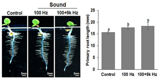 Sound wave treatment promotion of Arabidopsis thaliana root growth. Seeds were exposed to 100 or 100 + 9k Hz sound waves and seedlings were observed on the 5th day after sowing using an optical microscope (×10; left panel). The graph shows the average primary root length for each treatment (± standard error). Different letters above the bars indicate significantly different mean values (p < 0.05) based on Duncan’s multiple range test. Scale bars represent 2 mm. Images show representative individuals of at least 50 seedlings in three or more replicate experiments.