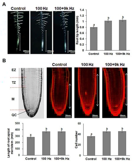As plants can distinguish between different types of sound waves, it is probable that different frequency ranges may have specific effects on growth and development. However, the optimal sound frequency for any given effect depends on the crop type, exposure time, and application duration; moreover, the mechanisms of sound effects on plants are unclear []. In the present study, Arabidopsis seeds were exposed to sound waves at two frequencies (100 and 100 + 9k Hz) to determine the appropriate frequency to promote root growth and development. The findings of the study showed that 100 and 100 + 9k Hz treatments were quite effective in improving root growth and development (Figure 1). Increased root growth was accompanied by an increase in the size of the root tip and the number of cells and length of the root apical meristem (Figure 2). These results indicate that exposing Arabidopsis seeds to specific sound waves promotes root growth by increasing the length and number of cells in the root apical meristem at the seedling stage.