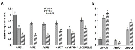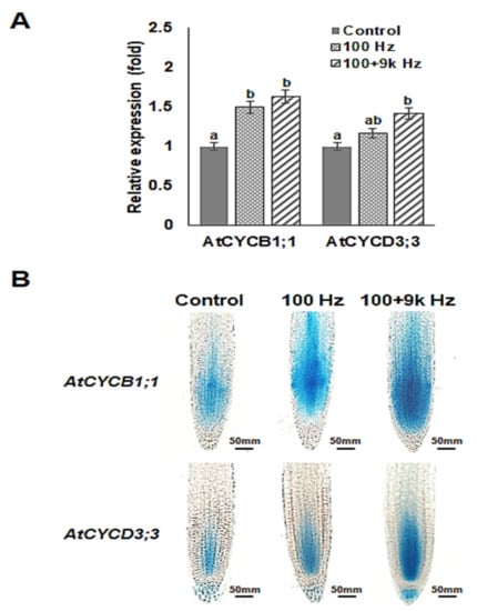 Furthermore, the expression profiles of genes involved in cell division (AtCYCB1;1 and AtCYCD3;3) in the roots of Arabidopsis exposed to sound waves were examined (Figure 3). There was a significant increase in the expression of AtCYCB1;1 and AtCYCD3;3 in the roots of the Arabidopsis in the 100 and 100 + 9k Hz treatments compared with that of the Arabidopsis in the control group (Figure 3A). Particularly, the expression of AtCYCB1;1 increased more than 1.5-fold in the roots of the Arabidopsis exposed to sound waves compared with that in the Arabidopsis in the control group, indicating that sound wave treatment of seeds regulates the expression of genes involved in cell division in roots after germination.