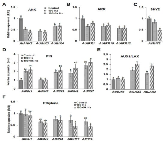 Effect of sound wave treatments on the expression of hormone-related genes in Arabidopsis roots. qRT-PCR was used to determine the expression levels of genes related to cytokinin ((A), AHKs; (B), ARRs), auxin ((D), PINs; (E), AtAUX1, AtLAX2, and AtLAX3), and ethylene ((F), AtEIL1, AtEIN2, AtEIN3, AtERF1, and AtPIF4) pathways, as well as AtSHY2 (C). The values were normalized to the value of the control. qRT-PCR error bars indicate the standard error of the mean of three biological replicates. Different letters above the bars indicate significantly different mean values (p < 0.05) based on Duncan’s multiple range test.
