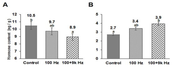 To examine whether the altered expression of cytokinin and auxin biosynthetic genes affects the phytohormone content in the roots, we determined the zeatin and IAA contents of the roots using liquid chromatography-mass spectrometry (LC-MS). While the 100 Hz sound wave slightly affected the phytohormone contents of the roots, the 100 + 9k Hz sound wave significantly reduced the zeatin and increased the IAA contents of the roots (Figure 6). The root zeatin content of the Arabidopsis in the control group was 10.5 ng/g, while that of the Arabidopsis in the 100 and 100 + 9k Hz treatments was 9.7 and 8.9 ng/g, respectively (Figure 6A). The root IAA content of the Arabidopsis in the control group was 2.7 ng/g, while that of the Arabidopsis in the 100 and 100 + 9k Hz treatments was 3.4 and 3.9 ng/g, respectively (Figure 6B).