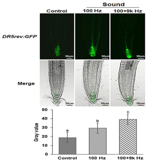 To verify the increased auxin content in the roots due to pre-germination sound waves, we observed the expression of GFP signals in the transgenic seedlings. Exposure of seed to sound waves significantly increased the GFP signals near QC cells (Figure 7).
