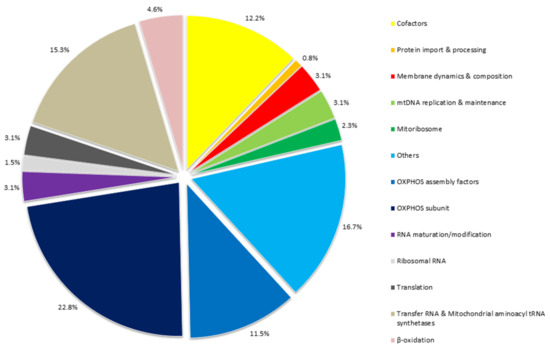 Several variations in mitochondrial and OXPHOS-related nuclear protein coding genes cause a reduction in enzyme function in one or more of the RC complexes, while mt-tRNA mutations may impair mitochondrial translation, by decreasing the availability of functional mt-tRNAs [31]. These dysfunctions, overall, cause defects of the oxidative phosphorylation system and subsequently impair the ATP production, leading to different phenotypes, depending on the tissue involved, type of pathogenic mutations and heteroplasmy level [10,11]. Estimates suggest that about 15–20% of RC defects are due to mtDNA mutations, while the remaining are caused by defects in nuclear genes [19,32].