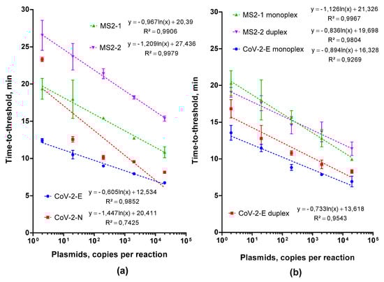 (a) LAMP with plasmids and different primers for SARS-CoV-2 and MS2; (b) LAMP with standard plasmids, monoplexes SARS-CoV-2, MS2 and duplex primer set MS2-SARS-CoV-2-E. Each primer set is marked by the color specified in the legend. Time-to-threshold (Tt) values are presented on the X-axis, and the amount of template per reaction on the Y-axis. Each run was triplicated; error bars represent one SD.