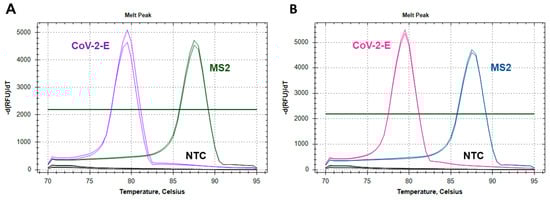 Melting curve analysis of the LAMP products. The graph represents characteristic melting peaks for LAMP products obtained with (A) monoplexes CoV-2-E (pink curves) and MS2 (blue curves); (B) duplex MS2-CoV-2-E, where green curves correspond to MS2 and purple curves to CoV-2-E.
