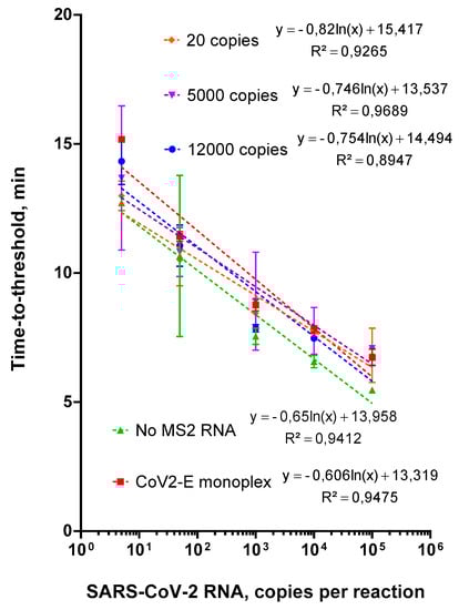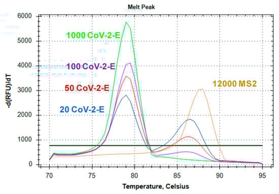 We determined an optimal concentration of the control MS2 RNA. We compared the amplification efficiency of CoV-2-E primers or the MS2-CoV-2-E duplex using serial dilutions of CoV-2-E RNA on the background of MS2 RNA (12,000, 2500 or 20 copies per reaction). The height of the corresponding peak on the melting curve served as an assessment criterion of the amplification efficiency. The results of the comparison are presented in Figure 4. The detection of more than 100 CoV-2-E RNA copies per reaction was achieved with all concentrations of MS2 RNA. However, the Tt values for 2500 and 20 MS2 RNA copies per reaction were 15 and 20 min, respectively, whereas 100 copies of CoV-2-E RNA were detected in 12 min (Figure S1). Thus, the use of fewer than 12,000 copies of MS2 RNA per reaction would only increase the total analysis time, without increasing the sensitivity of SARS-CoV-2 RNA detection. For further analysis, we used the MS2 phage as an internal control for isolation and amplification, in the amount equivalent to approximately 12,000 copies of MS2 RNA in the LAMP reaction mixture.