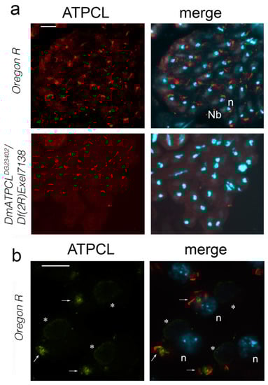 ATPCL localizes at the acroblast. (a) Partial cysts of spermatids from wild-type (Oregon R) and DmATPCLDG23402/Df(2R)Exel7138 hemizygous mutants stained for ATPCL (red) and DAPI (blue). Note a juxtanuclear localization of ATPCL that is missing in the mutant spermatids. Localization of ATPCL in the nebenkern (Nb) is unspecific. Scale bar = 10 µm; (b) Wild-type onion stage spermatids stained for ATPCL (green in the merge), the Golgi marker Lava Lamp (LAVA, red) and DAPI (blue) showing that ATPCL colocalizes with LAVA in the acroblasts (arrows). Nb = Nebenkern; n = haploid spermatid nuclei; * = unspecific staining on nebenkern. Scale bar = 5 µm.
