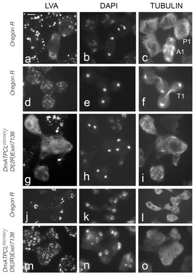 - Morciano, P.; Di Giorgio, M.L.; Porrazzo, A.; Licursi, V.; Negri, R.; Rong, Y.; Cenci, G. Depletion of ATP-Citrate Lyase (ATPCL) Affects Chromosome Integrity Without Altering Histone Acetylation in Drosophila Mitotic Cells. Front. Physiol. 2019, 10, 383. [Google Scholar] [CrossRef] [PubMed]