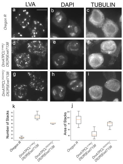 In wild-type Oregon R mature primary spermatocytes, Golgi structures appear as distinct ring or horseshoe-like structures (Figure 3a–c). At prometaphase I, the Golgi appear fragmented and this fragmentation is maintained through metaphase I, leading to the formation of LVA-positive spots that decrease in size and increase in number (Figure 2a). These observations are consistent with published results indicating that the Golgi apparatuses are disassembled during meiosis [13,16,17]. During anaphase I and telophase I, the Golgi are excluded from the spindle midzone, segregate to both poles and became enriched around the daughter nuclei (Figure 2a,b). After telophase I and in secondary spermatocytes, the Golgi are redistributed throughout the cytoplasm, but the cells lack the ring- and horseshoe-like structures typical of primary spermatocytes. The localization and distribution patterns of the Golgi during meiosis II is very similar to that of meiosis I, and ultimately they give rise to a ribbon-like formations in the onion stage spermatids as described above (Figure 2j). These ribbon-like formations break as the spermatids elongate leaving few acroblast remnants. The analysis of DmATPCL01466/Df(2R)Exel7138 and DmATPCLDG23402/Df(2R)Exel7138 mutant testes revealed that in pre-meiotic primary spermatocytes both number and size of Golgi stacks in mutant spermatocytes were different compared to control. In particular, the Golgi appeared fragmented and consequently LVA-positive spots more numerous and smaller than control (~40–50 vs. ~20 stacks/cells; p < 0.05) (Figure 2d,g,j,k), which is also reminiscent of the dispersed Golgi structures in the onion stage spermatids. Furthermore, the Golgi distribution and segregation during both normal and irregular meiotic divisions (appreciable only in the DmATPCLDG23402 mutant combinations; see above) appeared normal, indicating the ATPCL is not required for the Golgi distribution (Figure 2g). However, whether the effects on the Golgi specifically influence the entry (cis) face, where newly synthesized proteins from the ER enter the Golgi, or the exit (trans face), where they leave the Golgi, remains unaddressed. Overall, our observations indicate that in the absence of DmATPCL, meiotic cells fail to properly assemble the Golgi, suggesting that DmATPCL regulates the dynamic nature of the Golgi apparatus. Defects in the Golgi organization were rescued by the expression of a wild-type UAS DmATPCL transgene under the control of a TubGal4 promoter in DmATPCLDG23042 mutant background, confirming that they indeed arose as a consequence lesions in the DmATPCL gene. Yet, this requirement of DmATPCL seems restricted only to spermatogenesis as the Golgi organization in somatic tissues of DmATPCL mutant larvae appeared normal (Figure S1), confirming a predominant role for DmATPCL specifically during male-meiosis [8,14].