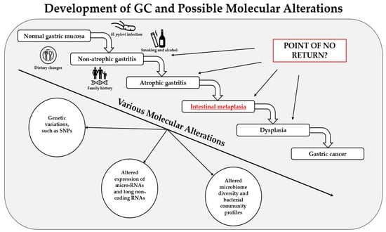 In conclusion, the latest progress in novel diagnostic methods allows scientists to identify various molecular alterations in gastric intestinal metaplasia, such as polymorphisms in various genes, changes in the expression of miRNAs and lncRNAs, and altered microbiome profile. Some of these alterations have strong associations with intestinal metaplasia and a potential to be used as one of the tools for the screening, treatment, and prognostic purposes; however, the use of current findings in real-life clinical practice is still very limited. One of the most important limiting factors is the inhomogeneity of the studies, such as the lack of data on concomitant H. pylori infection, lack of risk modification by HP CagA status, heterogeneous methods used to assess preneoplastic gastric lesions, uneven or small cohorts, etc. Therefore, further large-scale studies and clinical trials with standardized methods designed by multicenter consortiums are needed. As of today, various molecular alterations in intestinal metaplasia could become a part of personalized medicine, which would help us deliver a personalized approach for each patient and identify those at risk of progression to gastric cancer.