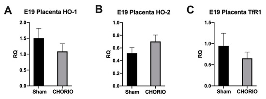 Figure 1. Placenta gene expressions for HO-1, HO-2, and TfR1 24 h after CHORIO, at E19, 24 h after CHORIO, at E19, no significant differences in placental gene expressions of HO-1 ((A) n = 4 for CHORIO, n = 3 for sham), HO-2 ((B) n = 4 for CHORIO, n = 3 for sham) or TfR1 ((C) n = 3 for CHORIO, n = 3 for sham) was detected compared to sham. p > 0.05, data normally distributed, Welch’s t-test, 2-tailed, mean ± SEM.