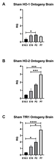 Figure 2. Ontogeny of HO-1, HO-2, and TfR1 in Sham Brains. Normal developmental regulation of HO-1 ((A) n = 3, 5, 10, 7, P2 vs. E18.5, * p = 0.0394), HO-2 ((B), n = 6, 8, 7, 7, P7 vs. E18.5, *** p = 0.0006, P7 vs. E19, *** p = 0.0009), and TfR1 ((C), n = 7, 8, 6, 7, P2 vs. E18.5, * p = 0.0169, P7 vs. E18.5, **** p < 0.0001, P7 vs. E19, * p = 0.0275) is displayed at E18.5, E19, P2, and P7 respective postnatal ages. p significant when <0.05, Kruskal–Wallis test, mean ± SEM.