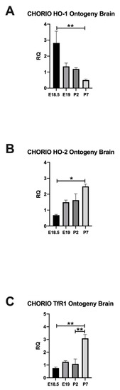 Figure 3. Ontogeny of HO-1, HO-2, and TfR1 in CHORIO. Effect of CHORIO on the developmental regulation of HO-1 ((A), n = 8, 4, 3, 7, E18.5 vs. P7, ** p = 0.0028), HO-2 ((B), n = 6, 3, 5, 7, P7 vs. E18.5, * p = 0.0011) and TfR1 ((C), n = 7, 6, 6, 7, P7 vs. E18.5, ** p = 0.0022, P7 vs. P2, ** p = 0.005) is displayed at E18.5, E19, P2, and P7 respective postnatal ages. p significant when <0.05, Kruskal–Wallis test, mean ± SEM.