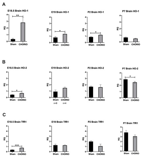 Figure 4. CHORIO alters HO-1, HO-2, and TfR1 expressions in brain compared to Sham. At E18.5, CHORIO upregulated HO-1, ** p = 0.0061 (A), HO-2, * p = 0.0152 (B), and TfR1, *** p = 0.0006 (C) in brains compared with sham. At E19 and P2, CHORIO upregulated HO-1, * p = 0.0317 and * 0.0490, respectively (A) in brains compared with sham. At P7, CHORIO downregulated constitutional HO-2 expression, * p = 0.0175 (B) significantly compared with sham. p significant when < 0.05, Kruskal–Wallis test, mean ± SEM.