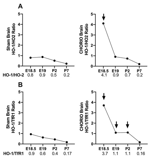 Figure 5. CHORIO-induced increase in HO-1/HO-2 and HO-1/TfR1 ratios in developing brain. Acute alteration of HO-1/HO-2 ratios in CHORIO brains compared with sham 6 h after initial insult (A). Initial acute alteration of HO-1/TfR1 ratios in CHORIO brains is sustained until P2, 7-days post initial insult in CHORIO brains compared with sham (B). Arrows indicate increased HO-1/HO-2 at E18.5 and HO-1/TfR1 at E18.5, E19 and P2 when compared with Sham.