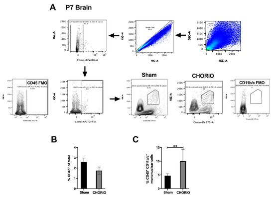 Figure 6. CHORIO-induced increase in brain mononuclear cells at P7. Single cells, live cells and CD45+ CD11b/c positive mononuclear cell population were identified by sequential gating. CD45 FMO and CD11b/c FMO controls were utilized to identify gating boundaries as shown in (A). No change in total CD45+ was detected between CHORIO and sham brains (p > 0.05, not normally distributed, Mann–Whitney) (B). Significant increase in the percentage of CD45 + CD11b/c+ mononuclear cells in CHORIO brains at P7 compared with sham (** p = 0.0098, normally distributed, Welch’s t-test, mean ± SEM), (C).