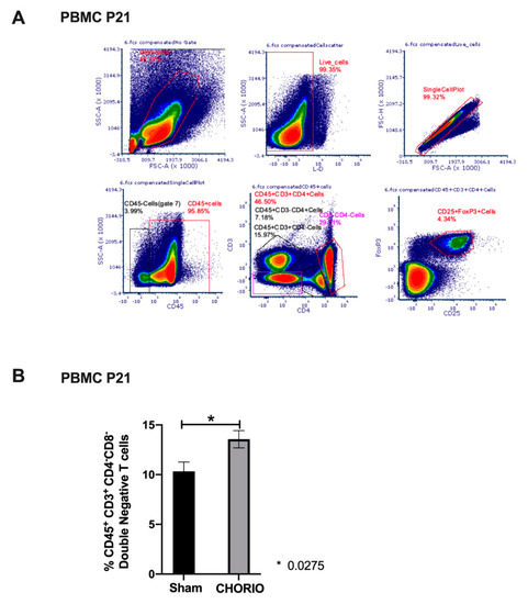 Figure 7. CHORIO induced increase in peripheral blood CD45+CD3+CD4CD8 T cells at P21. Representative gating strategy for PBMC analysis from a CHORIO pup at P21 (A). FMO controls were utilized for all fluorophores in the panel. CHORIO resulted in a significant increase in the percentage of CD45+CD3+CD4CD8 T cells from P21 pups compared with sham (* p = 0.0275, normally distributed, Welch’s t-test, mean ± SEM), (B).