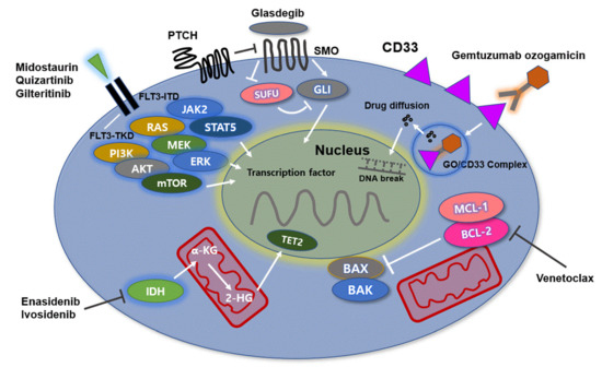 In addition, TP53 mutation is strongly indicative of adverse prognosis in AML and is mostly characterized by secondary AML patterns and complex cytogenetics [15]. In this review, we will discuss the most important molecular mutations, such as CD33, FLT3-ITD, BCL2, and IDH1/2 mutations and aberrant hedgehog signaling, and the associated targeted approaches in patients with AML, along with the US FDA approval status of each approach.