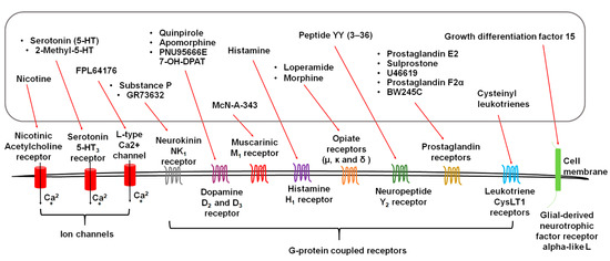 A schematic representation of emetic ligands or agonists, acting on the corresponding cell membrane-located receptors, including calcium-permeable ion channels and G-protein coupled receptors.