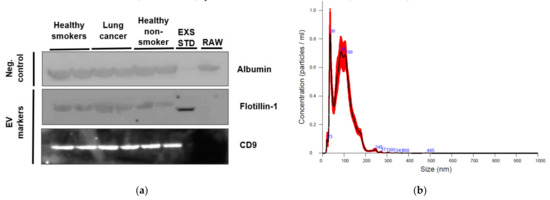 An aliquot of EVs isolated from plasma of two healthy non-smokers, two healthy smokers and two lung cancer participants were characterized using western blotting, while one healthy non-smoker case underwent nanoparticle tracking analysis (NTA).